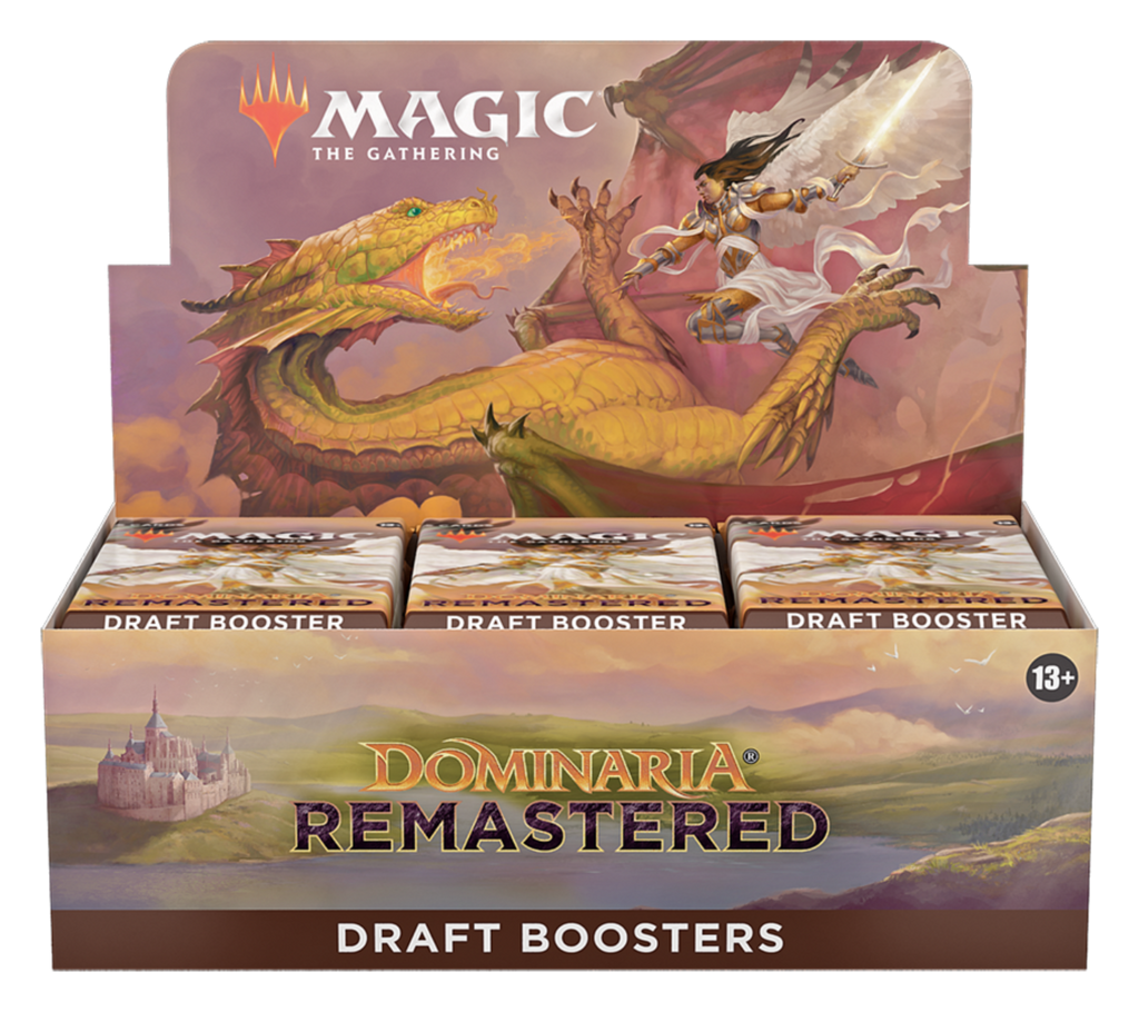 The Dominaria Remastered Draft Booster Box contains 36 Dominaria Remastered Draft Boosters. Each Draft Booster contains 15 cards and 1 token/ad card, including 1 card of rarity Rare or higher and 2–4 Uncommon, 9–11 Common, and 1 Retro Land cards. Traditional Foil of any rarity replaces a Common in 33% of boosters.
