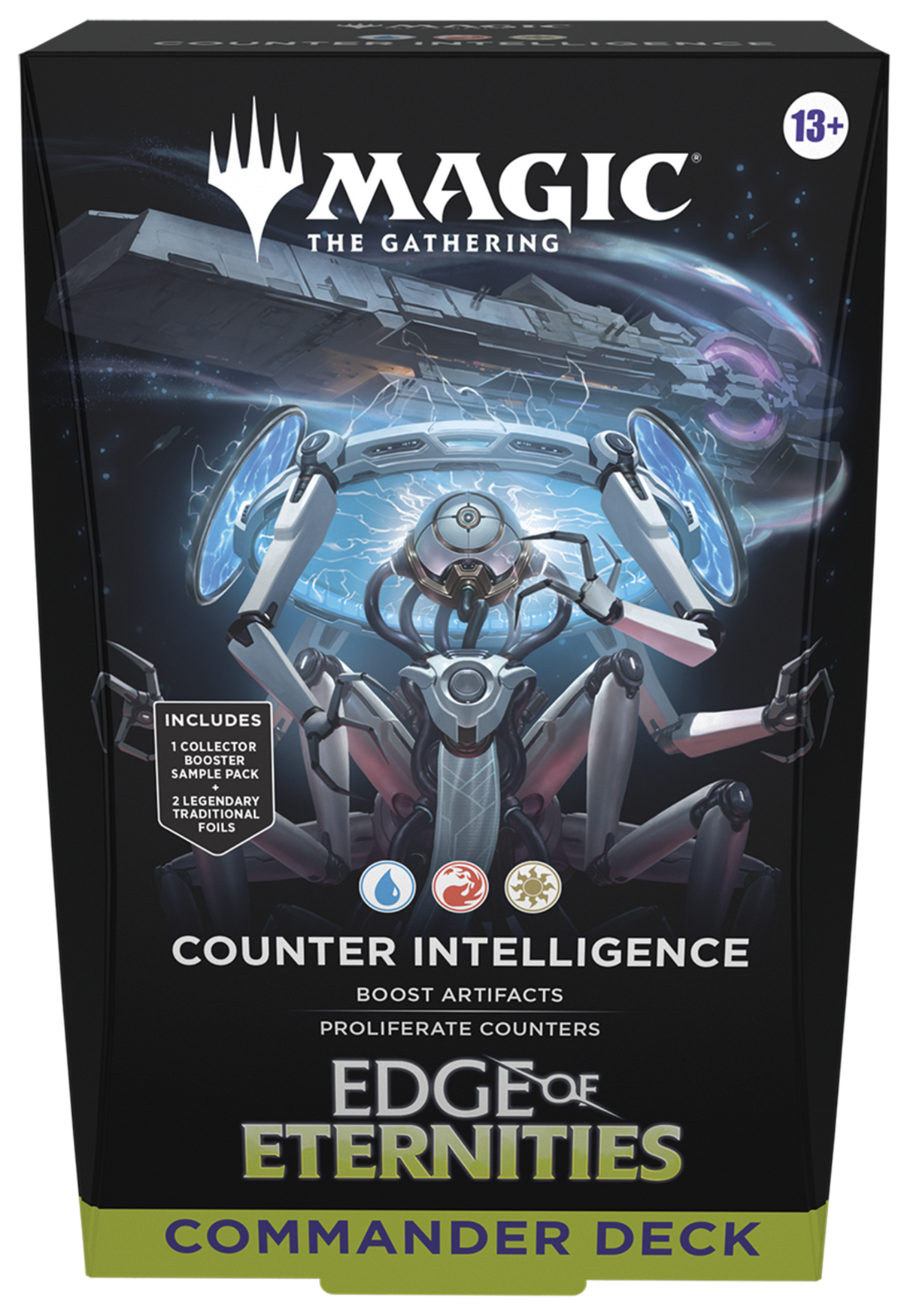 Embark on a cosmic journey with the Counter Intelligence Commander Deck, part of Magic: The Gathering's Edge of Eternities set. This Jeskai-colored (blue, red, white) preconstructed deck is designed for the Commander format, offering a unique blend of space fantasy and strategic gameplay. Utilize artifact synergies and proliferate counters to outmaneuver your opponents in the vast expanse of the Sothera system.