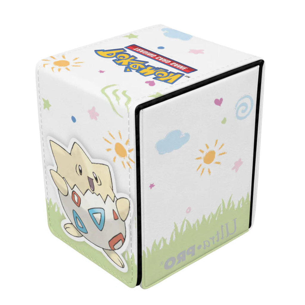 The Alcove Flip Deck Box for Pokémon TCG features vibrant, full-color artwork of Togepi among a joyous scene of colorful doodles, inspired by the playful innocence of childhood drawings. The strong magnetic closure keeps decks secure, and dual thumb notches offer easy access during gameplay. Store and protect up to 100 standard size trading cards double-sleeved in Ultra PRO Deck Protector® sleeves. Lid can be detached from either side of the box for easy access to your deck. Includes one Togepi deck divider.