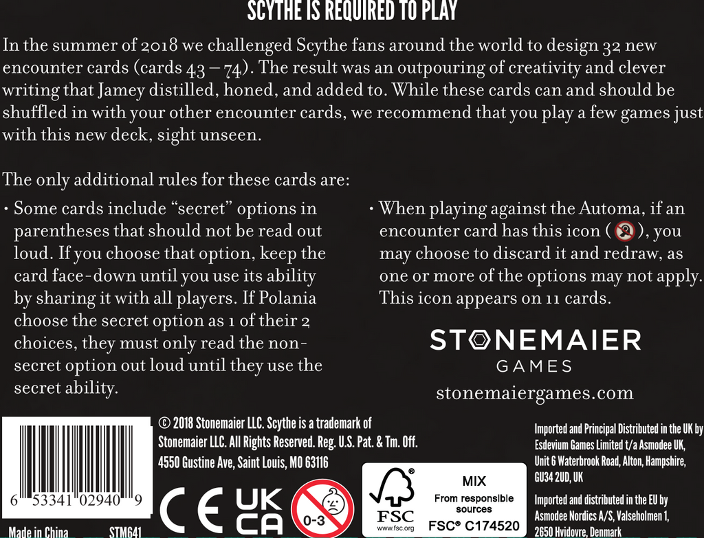 Scythe Encounters is a boxed set of 32 new promo encounter cards (43-74) designed by fans of Scythe and developed into the final cards by Jamey Stegmaier. We recommend that you play with this deck of cards by itself a few times to experience the new options before shuffling them into the original encounter deck.